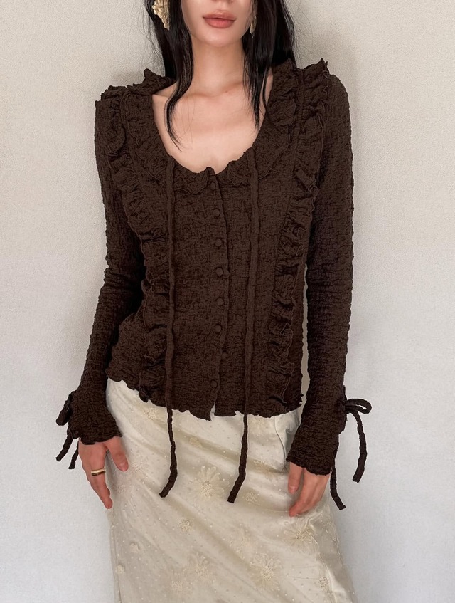 ふわりと軽やかに舞うような、贅沢フリルが主役のロマンティックトップス。 繊細なシャーリングと波打つようなフリルが、立体的で表情豊かなシルエットをつくり出します。 胸元のリボンディテールやスカラップ風のネックラインが、甘さと上品さを絶妙にミックス。 袖口や裾にはリボンがあしらわれ、どの角度から見ても印象的なディテールに。 柔らかく伸びのある素材で着心地も抜群。 デニムでカジュアルダウンしたり、レーススカートでとことんガーリーにも。 1枚でコーディネートの主役になる、ブランドらしさ満点のアイテムです。 バスト 90cm 着丈 47cm 厚み 普通 透け感 なし 伸縮性 あり 裏地 なし ■ 素材/製造国 韓国 ■ お手入れ/取り扱い注意事項 お手入れが簡単な素材を使用しているため、日常使いに便利です。しかし、直射日光を避けることや、水に長時間浸けないことをお勧めいたします。 ■ 発送・注文に関する情報や注意事項 商品の発送は、注文を受けてから迅速に行いますが、2-3週間ほどお時間をいただきます。在庫の状況によってはさらにお時間を要することもございますのであらかじめご了承ください。 ■ その他の情報や注意事項 お客様のご要望にできる限りお応えするよう努めておりますが、商品によっては在庫状況が異なる場合がありますので、あらかじめご了承ください。 ご質問や不明点がございましたら、ぜひショップのお問い合わせよりお気軽にお問い合わせください。あなたの素敵なライフスタイルに、interitasが寄り添えることを心から願っています。