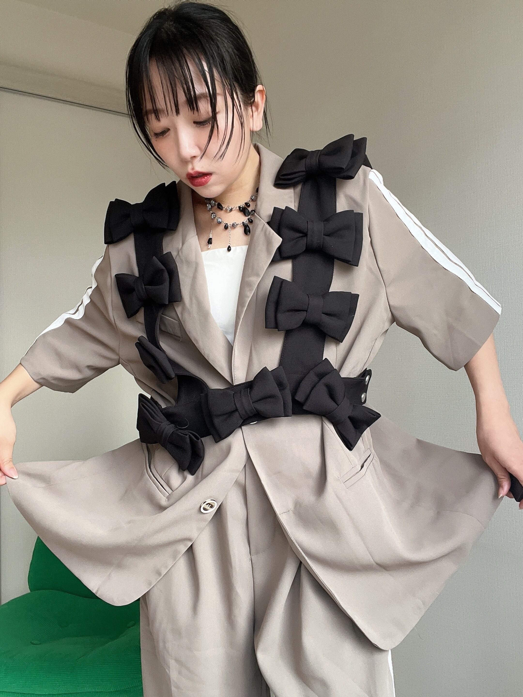 ベストのように重ねるだけで、シンプルなコーデが一気にアートピースに。