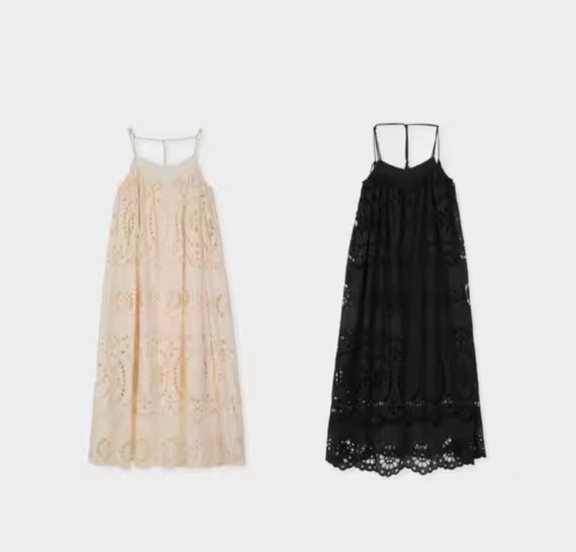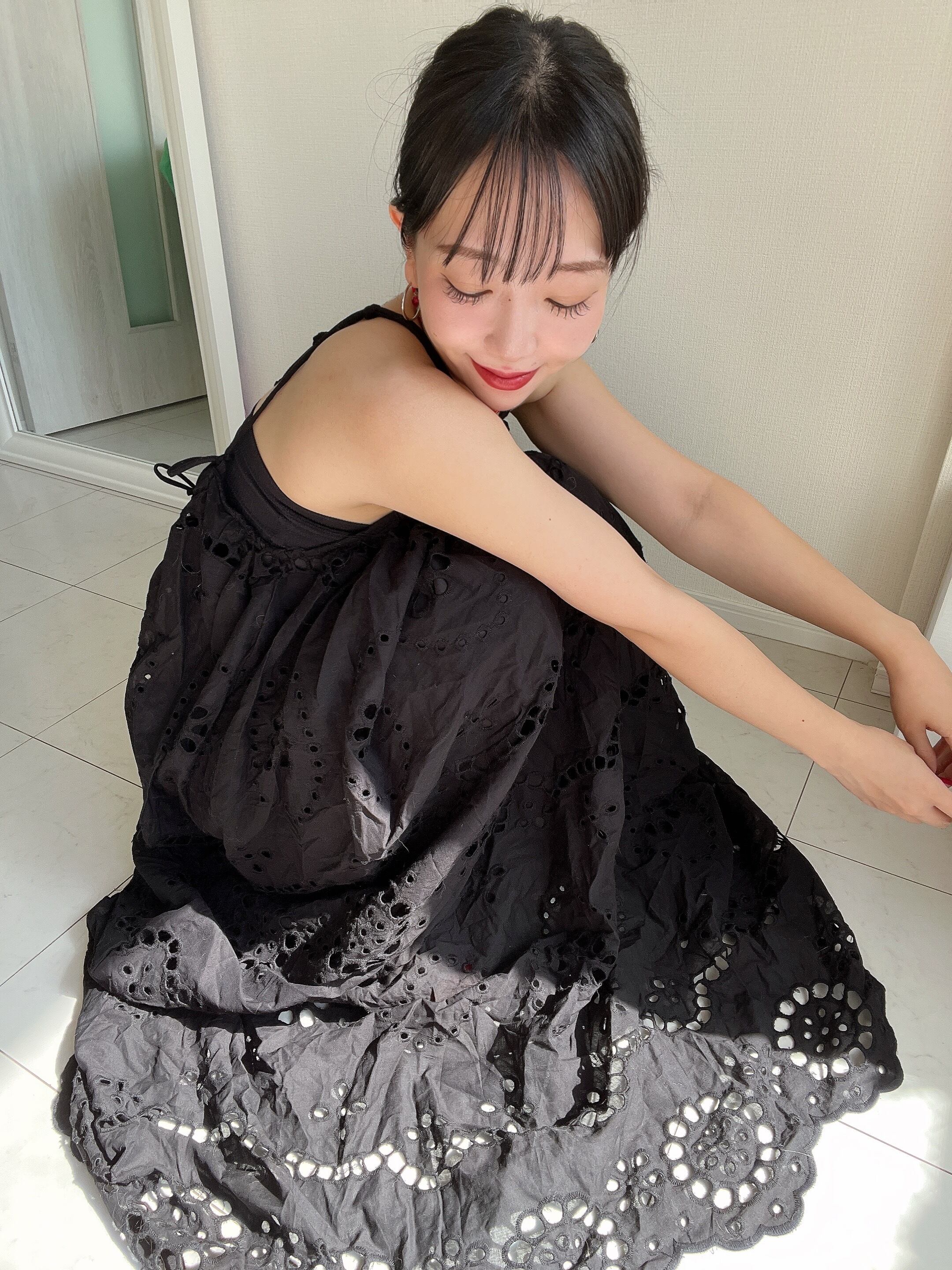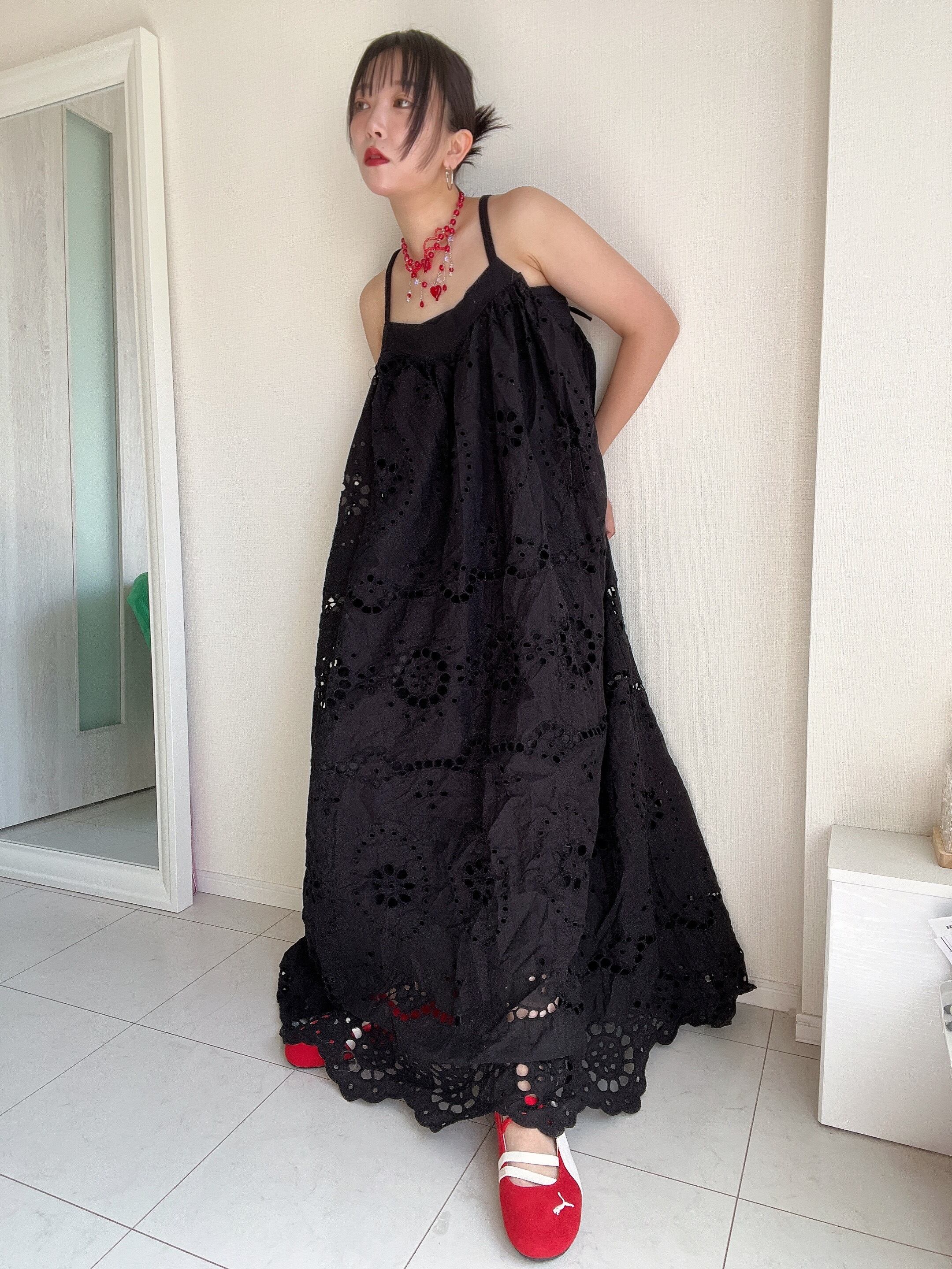 繊細なカットワークが印象的な、ふんわり広がるブラックワンピース。