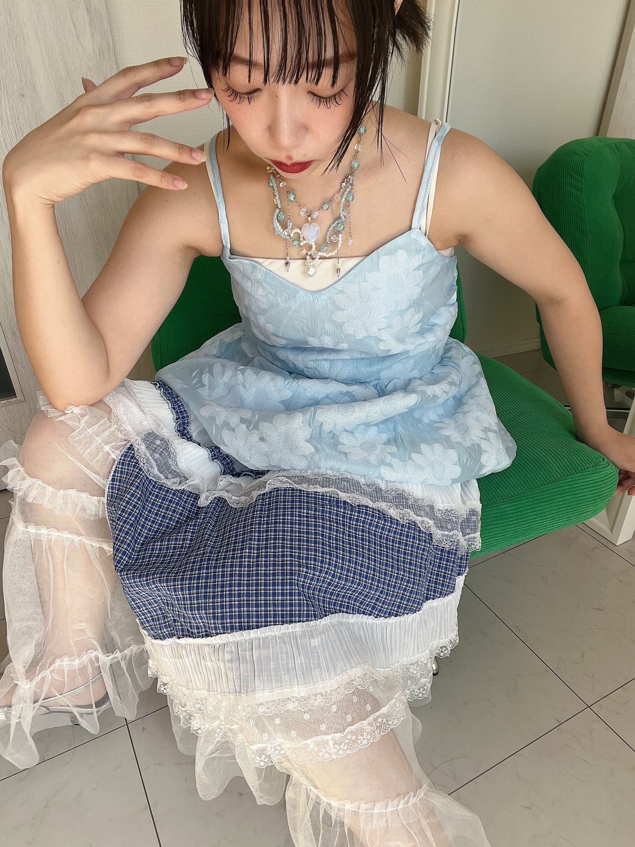 レースとチュールとチェック、異素材のレイヤーが生み出す軽やかな揺れ感。