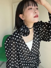 ふんわりとしたシアー素材に、クラシックなポルカドットを散りばめたラップブラウス。